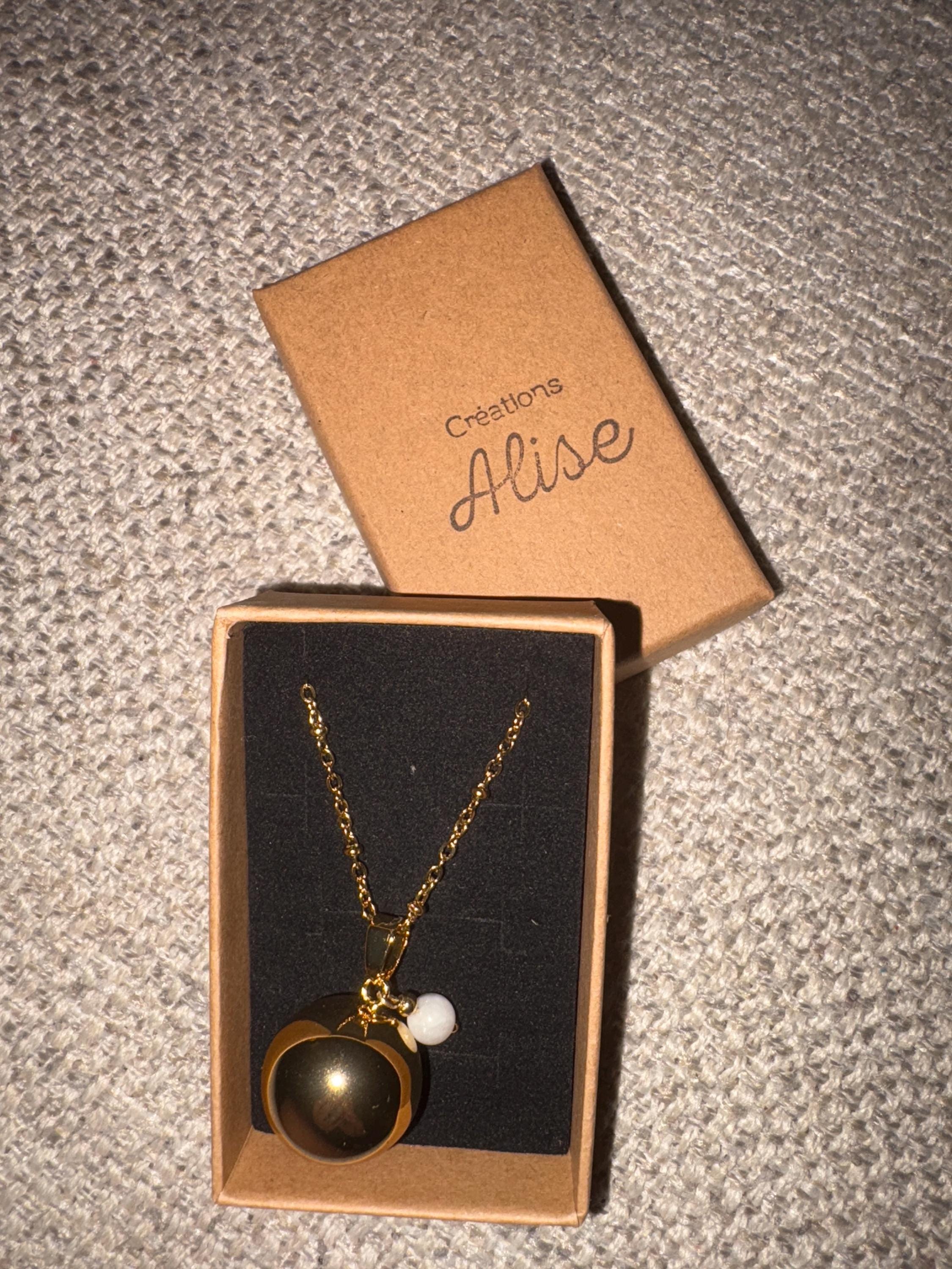 This long necklace, adorned with a ball-shaped pendant, rests on the belly and emits a gentle tinkling sound with each movement. This gentle melody soothes and rocks the baby throughout pregnancy.