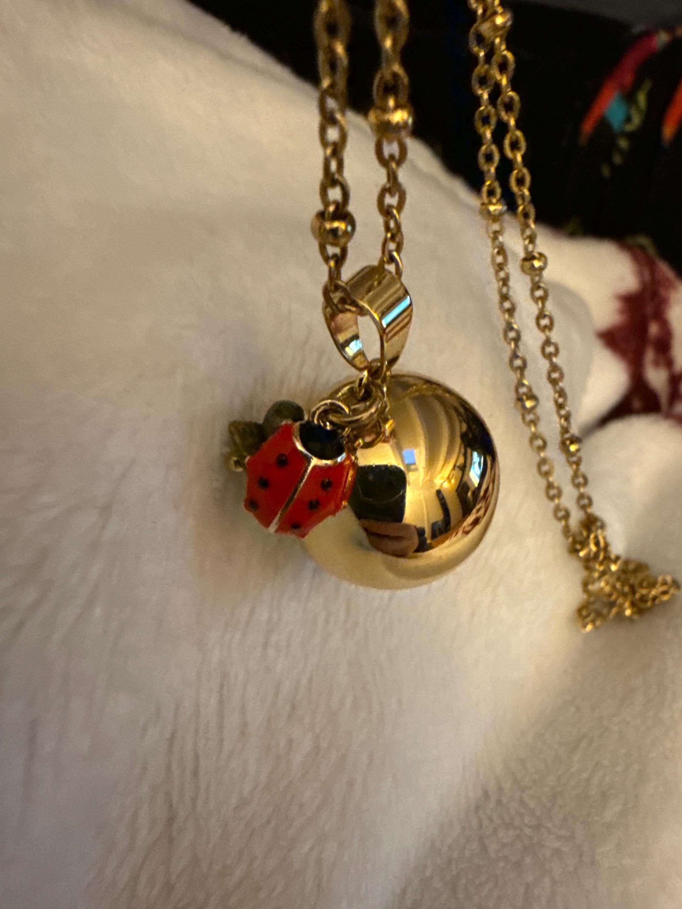 This long necklace, adorned with a ball-shaped pendant, rests on the belly and emits a soft chime with every movement. This gentle melody soothes and lulls the baby throughout the pregnancy.