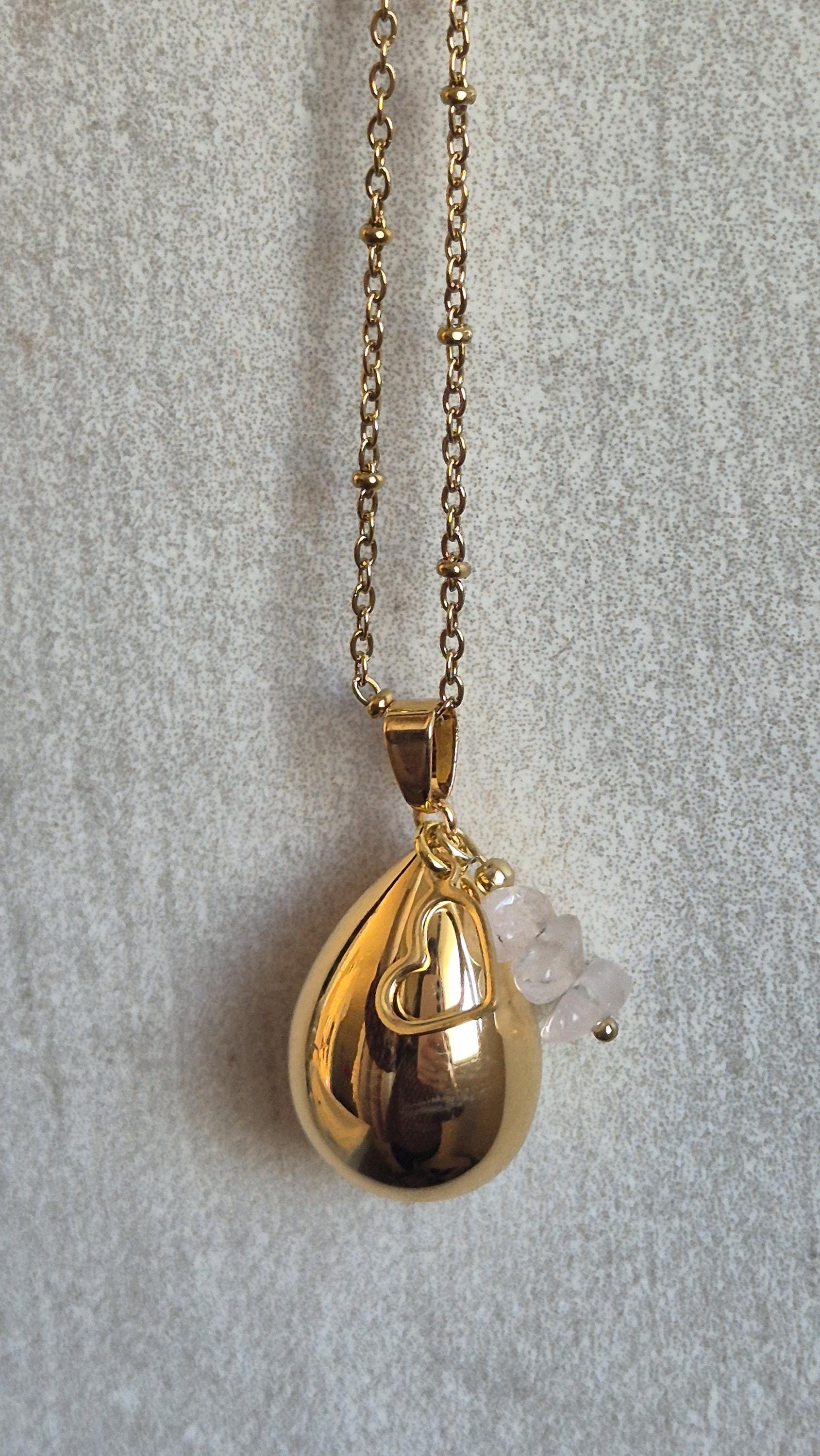 This long necklace, adorned with a ball-shaped pendant, rests on the belly and emits a gentle tinkling sound with each movement. This gentle melody soothes and rocks the baby throughout pregnancy.