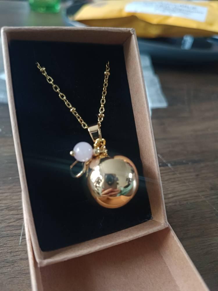 This long necklace, adorned with a ball-shaped pendant, rests on the belly and emits a gentle tinkling sound with each movement. This gentle melody soothes and rocks the baby throughout pregnancy.