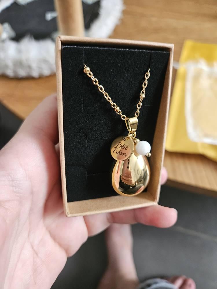 This long necklace, adorned with a ball-shaped pendant, rests on the belly and emits a gentle tinkling sound with each movement. This gentle melody soothes and rocks the baby throughout pregnancy.